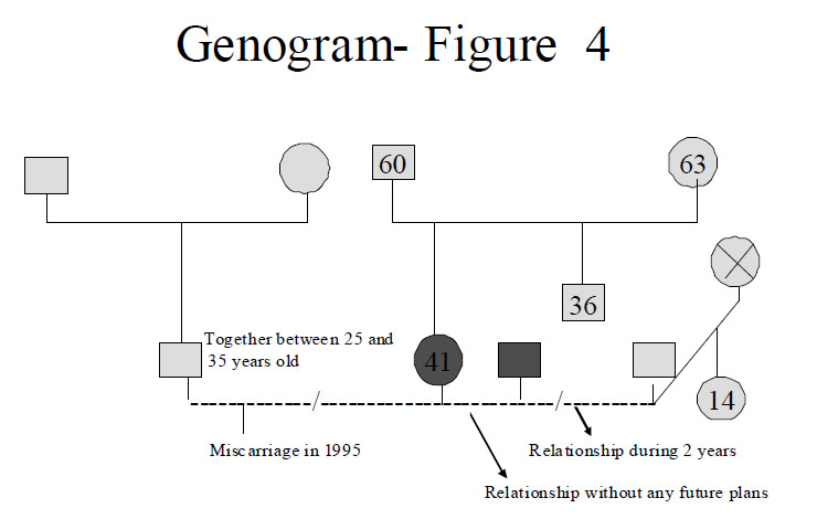 In close collaboration with the attending physicians, specific psychological counselling is offered to each patient or couple concerning the possible options for fertility preservation and their implications in cancer patients. The literature abounds in recommendations favouring the offer of counselling, yet the published articles provide limited information on the type of approach that is best suited to the needs of cancer patients concerned about their fecundity. Strategies are the communication skills of active listening typically used in a patient-centred approach [4, 5]. In practice our approach constitutes an extension of the techniques of preventive counselling routinely offered to all infertile couples undergoing ART at our institution (Women`s Hospital, CHUV, Lausanne) [6, 7]. This assistance has been developed and conceptualised over the last 18 years as part of the collaboration between clinical practitioners in medically assisted procreation, sexual and reproductive health counsellors, psychologists and psychiatrists [6, 7]. The primary advantage of this counselling approach is its rapid effectiveness in sorting out possible difficulties. Cancer patients are forced to make instant decisions because of the urgency of cancer treatment. The counselling is used in these cases to assess rapidly the woman’s (couple’s) resources in order to choose the best option for each woman’s specific situation. The so-called genogram is used as a select tool in resources evaluation [8]. It involves joining with the couple in building a genealogical tree during the interview by representing their families of origin (but also their relatives and friends if they have a significant relationship with the couple). Notes or lines are added to show the relationships between the individuals. By building the genogram together the necessary investigations are given a natural and coherent direction and the biographical issues and the couple’s interactions can be highlighted. Figures 1, 2, 3 and 4 outline this technique.