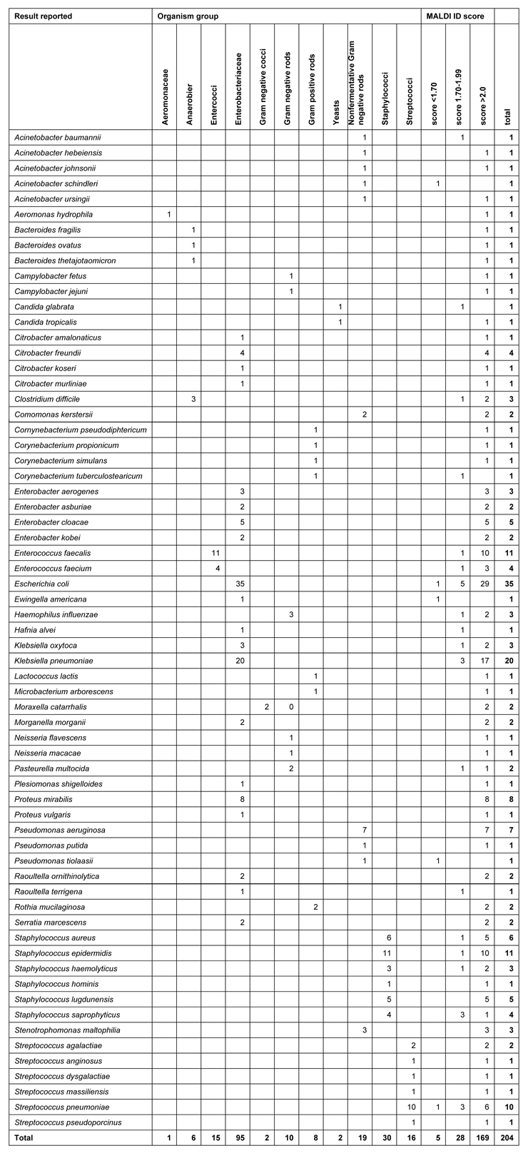 Clinical isolate characterisation listed by organism group and MALDI identification score