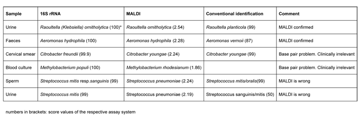 In 2 out of these 6 isolates, the MALDI TOF results were confirmed. In another 2 samples a clinically irrelevant minor base-pair difference between the species alignements was seen, whereas in one sperm and one urinary sample the putative discrepancy between Streptococcus mitisand pneumoniae assignment appeared again (see above) (table 3).