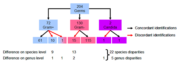 The three procedures reveal their results as a printout of the identified germ corroborated by a concurrence score. These are calculated by the intrinsic BLAST software of analysers which compare the data of the analyte with the data bank.