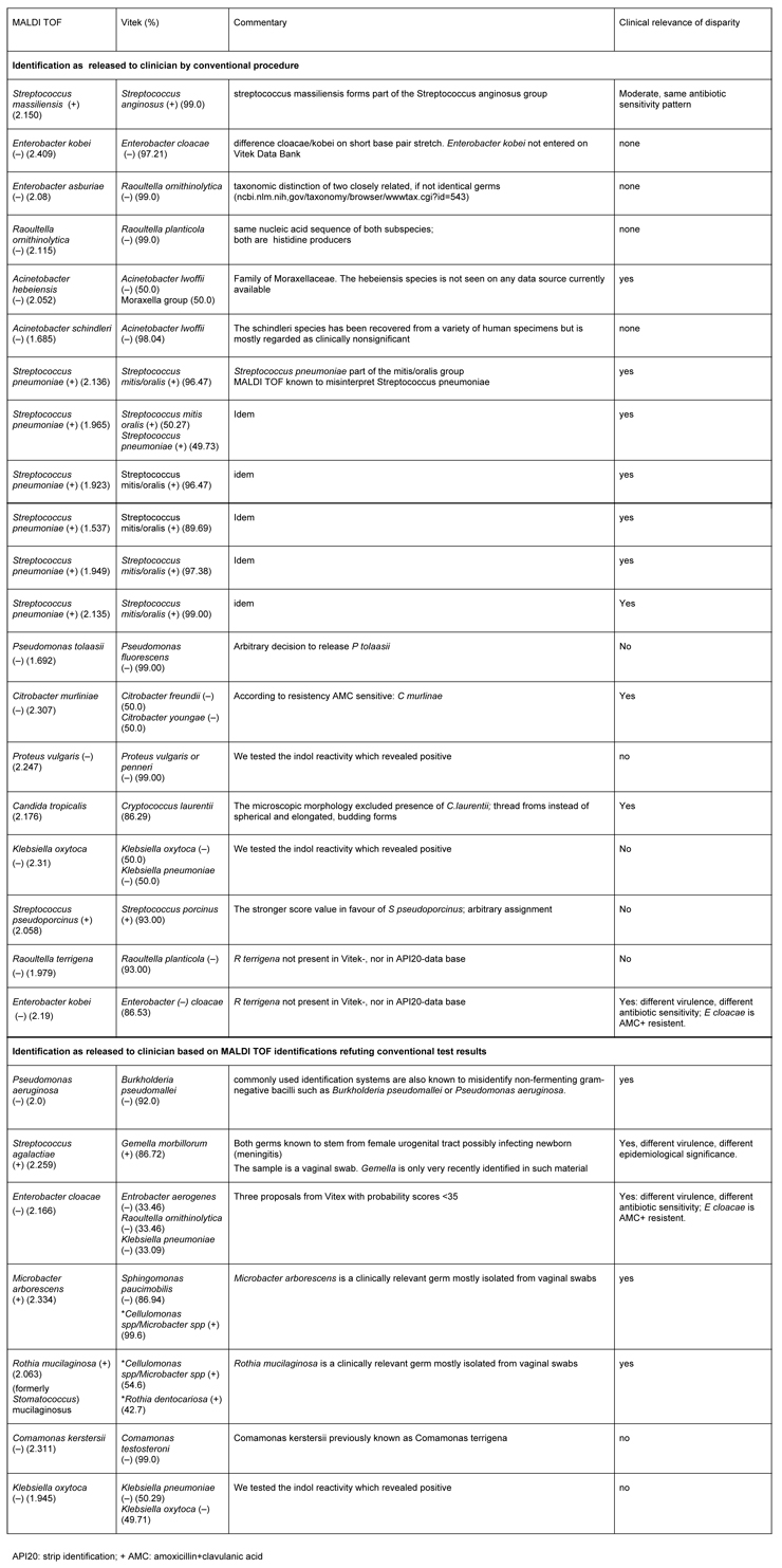 With respect to table 2a which lists the results released on the basis of conventional identification, our study supports the view that proteomics-dependent MALDI TOF should not completely outdate traditional metabolomic-dependent identification algorithms. These will be further needed in clinical microbiology, despite their shortcomings: time-consuming metabolic reactions, including resistance to antibiotic profiles, morphological and observer-dependent judgments. The future will confirm the economic impact of such widespread use of MALDI TOF. A recent report supports replacement of labour-intensive procedures by MALDI TOF [9]. Other endeavours adding value are under way: thus, broad-range PCR and microarray-based platforms designed to identify bacterial pathogens in positive blood cultures have proven sensitive, specific and almost as fast as MALDI, since they are based on amplification and detection of gyr B, par E, and mecA genes of the 50 most common bacterial species [10]. While such an approach might be integrated into everyday laboratory workflow in primary-care, its usefulness must still be proven for general care microbial diagnosis for which MALDI TOF seems more appropriate. The time saving approach now provided by the MALDI based protein fingerprinting of bacterial identity raises hope that daily rounds of treating physicians will further improve based on progress in the microbiology laboratory.