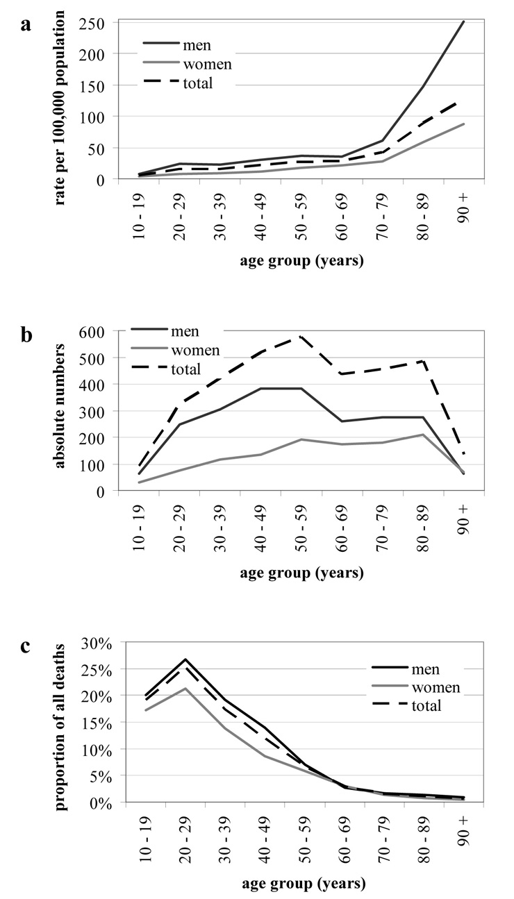Mean suicide rates per year (a), suicide counts (b) and suicide proportions of all deaths (c) by age group and sex, in the Canton of Zurich, 1995–2007.