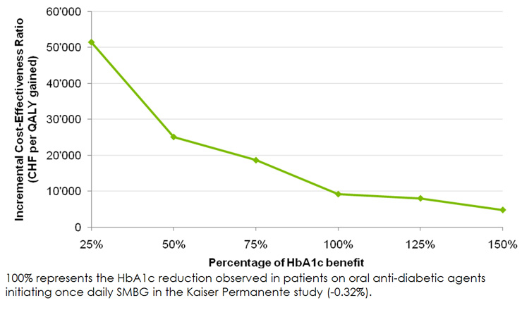 The sensitivity analyses demonstrated that projected outcomes were most sensitive to the time horizon of the simulation, the modelled HbA1c improvement and, to a lesser extent, the assumptions regarding progression of HbA1c (table 7). To assess the magnitude of the effect of HbA1c improvement on cost and effectiveness outcomes, a series of analyses were performed in which the HbA1c improvement was varied from 25% to 150% in 25% intervals, where 100% represented the HbA1c reduction observed in once daily SMBG patients in the Kaiser Permanente study. The ICERs from these analyses are presented in figure 2. The 25% “worst case” scenario gave an ICER of CHF 51'455 per QALY gained, which would still be considered cost-effective in the Swiss setting. The 150% scenario, which modelled an absolute HbA1c reduction of 0.48% in once daily SMBG users, resulted in a projected ICER of CHF 4'790 per QALY gained. Sensitivity analyses, in which the HbA1c progression was changed from the UKPDS regression formula to a linear increase of 0.15% per year, resulted in ICERs of CHF 9'990 per QALY (with the linear increase applied on both OADs and insulin) and CHF 10'046 per QALY (with the linear increase applied on OADs only and the UKPDS regression formula applied thereafter).
