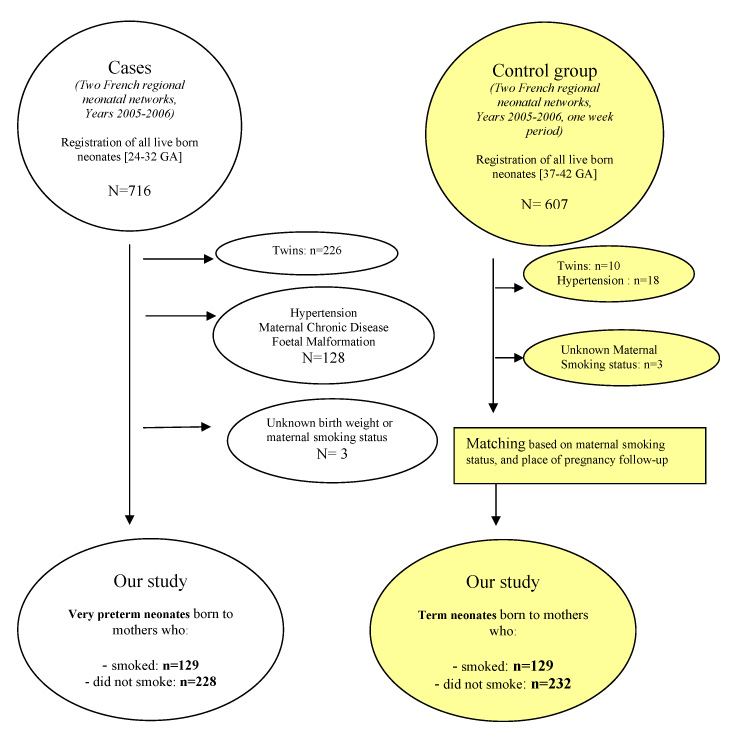 We included all live-born preterm infants (GA 24–32 weeks) delivered in all maternity unit (n = 30) located in our two regional perinatal networks (Poitou-Charentes & Franche-Comté), they served as cases. Infants were further subdivided into those born by mothers who did (129 infants) or did not smoke during pregnancy (229 infants).