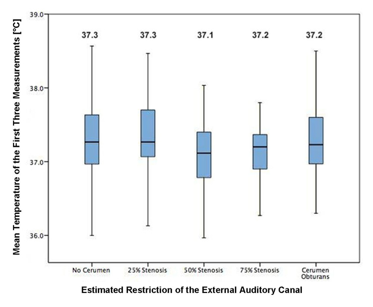 Infrared ear temperature measurements according to extent of cerumen. Box contains 50% of the median values, Whiskers define 95% CI.