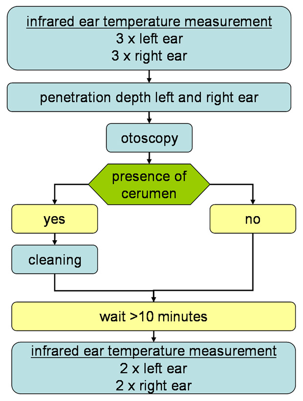 It was our hypothesis that five variables might influence the change in IET: removal of cerumen, instrumentation in the external auditory canal, acclimatisation to the room temperature in the emergency department, antipyretic medication, and a potential learning effect for directing the probe after otoscopy to the tympanic membrane.