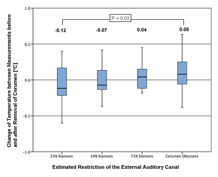 The primary endpoint, quantifying the impact of cerumen on IETM, represented a median rise of 0.20 °C (95% CI 0.10–0.28 °C, P = 0.03) after removal of cerumen obturans compared to the change of temperature after cerumen removal in patients with a 25% stenosis of the external auditory canal (fig. 3).