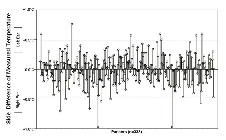 Effect of side of measurement on infrared Ear temperature measurement. Bland-and-Altman plot for comparison of right and left ear measurements. Dotted lines represent the upper and lower limit of the 95% confidence interval of the mean difference.