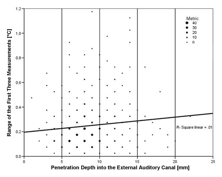 Correlation between penetration depth and range of infrared ear temperature measurement. Size of the dots represents number of measurements.