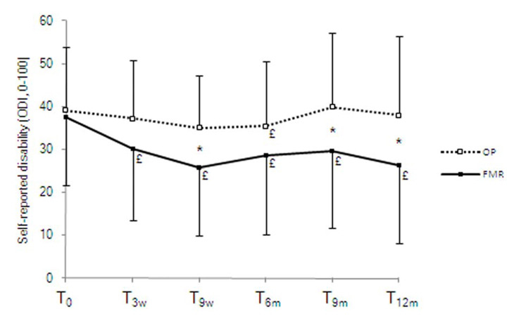 Self-reported disability (Oswestry disability index, ODI) for outpatient physiotherapy (OP) and functional multidisciplinary rehabilitation (FMR) at baseline (T), 3-week (T3w), 9-week (T9w), 6-month (T6m), 9-month (T9m) and 12-month (T12m) follow-up. £ indicates a significant within group difference compared to baseline; *, significant between groups difference.