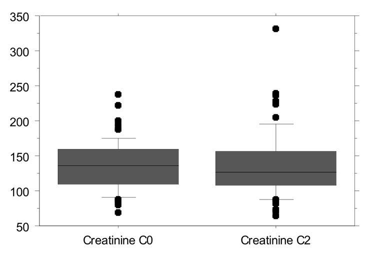 Mean creatinine plasma levels were 135.4 ± 34.88 µmol/L during C0 monitoring and 137.4 ± 47.08 µmol/L during C2 monitoring (p = 0.521, fig. 1). The creatinine clearance during the C0 monitoring period was 68.1 ± 32.74 ml/min vs. 67.9 ± 33.14 ml/min during the C2 monitoring period (p = 0.64, fig. 2). No changes in renal function during each period were observed. Mean plasma creatinine was 135 ± 38.29 µmol/L (start C0), 135.03 ± 42.19 µmol/L (start C2) and 133.31 ± 39.89 µmol/L (end C2) (p = 0.80). Mean urea blood levels were 11.97 ± 5.659 mg/dl during C0 and 12.68 ± 6.579 mg/dl during C2 monitoring (p=0.197).