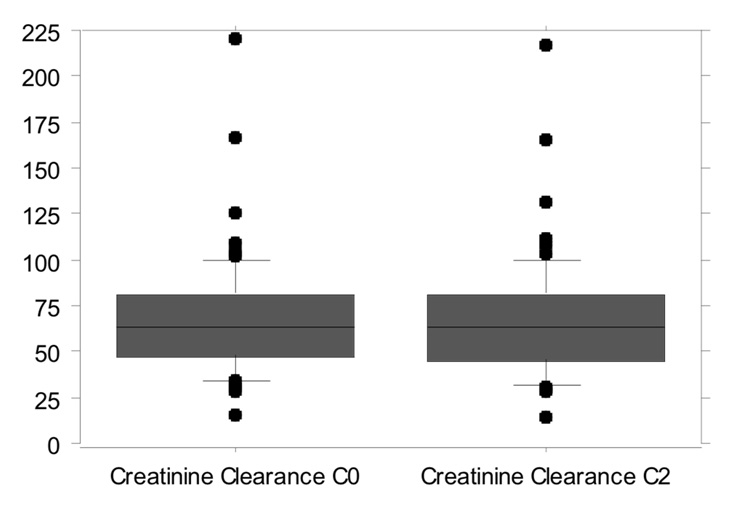 Creatinine clearance: 68.1 ± 32.74 ml/min during the C0 monitoring period vs. 67.9 ± 33.14 ml/min during the C2 monitoring period (p = 0.64).