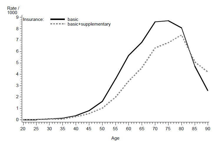 Incidence of total hip replacements in populations with basic or with basic plus supplementary health insurance.