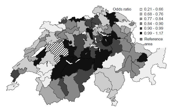 The study is based on information concerning the health insurance status of 67% of the Swiss population, and selection bias cannot be excluded. However, comparison of our data with those of the Federal Office of Public Health showed reasonable concordance on the overall distribution of insurance classes. It is also unlikely that hospitalisations of populations covered by insurance companies not participating in this project differed substantially from the observed patterns, as decisions to hospitalise a patient may be influenced by type of coverage but not necessarily by the brand name of the respective company. Effects of socioeconomic status and cultural attributes of populations could not be analysed, as the respective data are not available at the level of utilisation-based health service areas, but we were able to use data of the Swiss health survey to explain some of our results. Misclassification in relation to insurance group, health status and resource use are possible in this context, as respondents may not have correctly answered the respective questions, but the available data and other information within the same domain provide no indication of the existence, direction and extent of selection and misclassification bias. Other limitations refer to the fact that information on the actual medical needs of populations is not available, and conclusions on inequitable access to care across insurance groups should be approached with caution. It would also be interesting to analyse data incorporating information on physicians and hospitals. This would allow a discrimination of effects between hospital-based and affiliated physicians and between private and public hospitals. It was not in the scope of this article to provide an in-depth analysis of regional differences in the use of orthopaedic surgery. However, the observed regional patterns underpin the need for further research in this domain.
