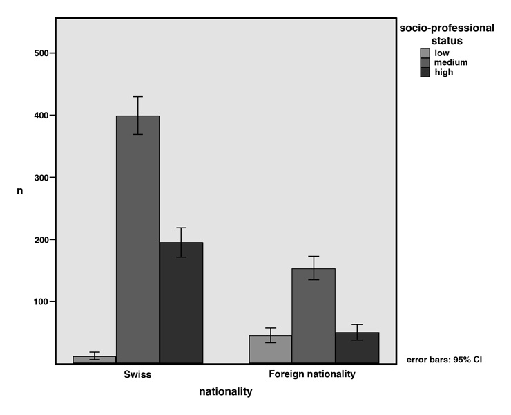 Figure 1 shows the distribution of different socio-professional levels of the parents of Swiss children and of children with an immigrant background. Chi-square test showed a highly significant difference in socio-professional status by nationality (p <0.001). An immigrant child in PICU is 9.82 times (95% CI 5.16 to 18.7) more likely to have parents belonging to the lowest strata of socio-professional status (unskilled employees and workers) than a Swiss child.