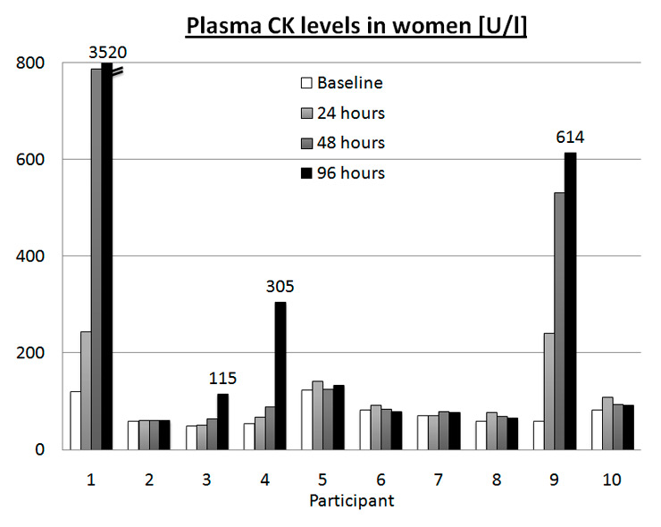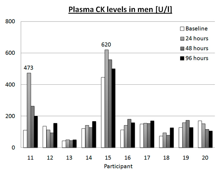 The investigations were carried out between March and April 2009. All participants completed the study. One participant had a baseline CK elevation at 446 U/l, which remained unexplained and asymptomatic. The CK response to exercise was highly variable. Five participants (25%) showed a significant increase post exercise, defined as a maximal value of at least double of the baseline value. Maximal values were reached on the first day post exercise for one participant, and on the fourth day for the remaining four. The highest CK value reached 3520 U/l and was measured in a female participant at 96 hours. Figure 2 shows the CK evolution in all participants.