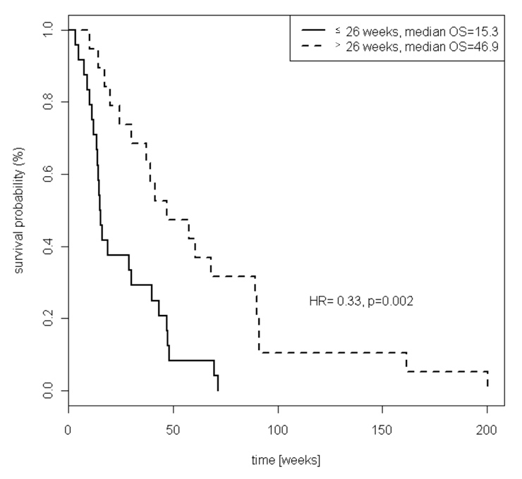 >26 weeks | 19 (44.2) | 46.9 | 0.33 (0.16–0.65) | 0.002 | |