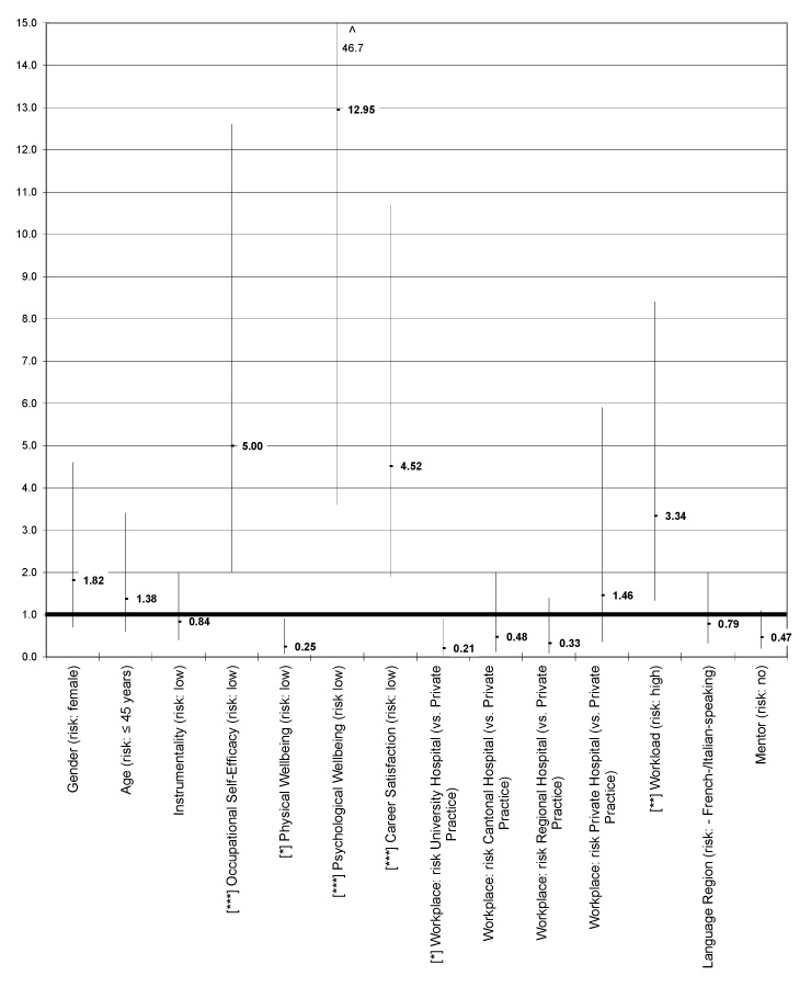 A total of 68 (26.8%) of 254 respondents assessed their professional satisfaction as low, and 182 (71.7%) as high. Results of the logistic regression are shown in the right column of table 1 and illustrated in figure 2. The minority of the supposed risk factors for low job satisfaction turned out to be significant within the proposed regression model. Participants with low occupational self-efficacy were 5 times more at risk for low job satisfaction than participants with high occupational self-efficacy. Rather unexpected, low physical wellbeing turned out to be a significant protective factor against low job satisfaction, while low mental wellbeing, low career satisfaction and high workload increased the risk of low job satisfaction to a larger or smaller extent. Working in a university hospital turned out to be a significant protection factor against low job satisfaction when tested against private practice, while other types of medical workplace were neither risk nor protection factors. Gender, age, language region, and having or not having had a mentor during medical training turned out to be no determinants of job satisfaction within the model.