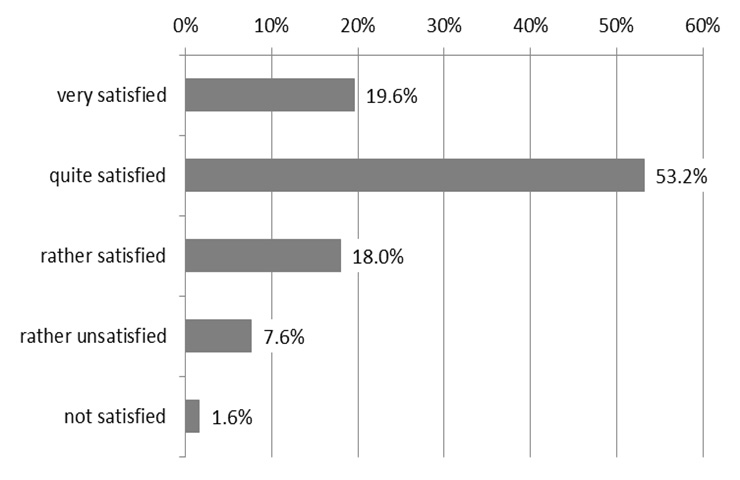 One in five of the respondents were ‘very satisfied’, more than half of the participants were ‘quite satisfied’, less than twenty percent were ‘rather satisfied’, and less than ten percent were ‘rather or not satisfied’ in their job.