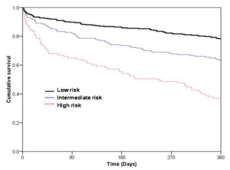 Kaplan-Meier curves demonstrating cumulative survival in patients with AHF over time according to risk groups: high risk group (BUN >27.5 mg/dl and age >86 years), intermediate risk group (BUN >27.5 mg/dl and age ≤86 years) and low risk group (BUN ≤27.5 mg/dl); p <0.001 by log-rank.