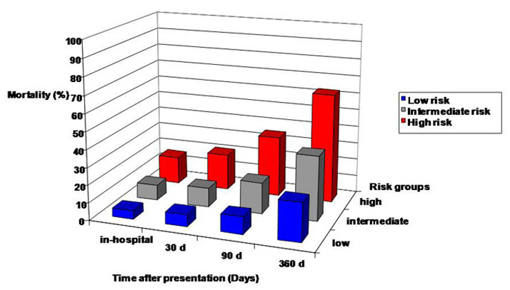 The CART tree with 1-year mortality data of each subgroup is depicted in figure 1. Figure 2 illustrates an increase in mortality according to risk group and the time interval after hospital presentation. The figure clarifies that BUN and age, as predictors of long-term outcome, are also suitably applicable for risk assessment regarding in-hospital mortality, mortality at 30 days and mortality at 90 days.