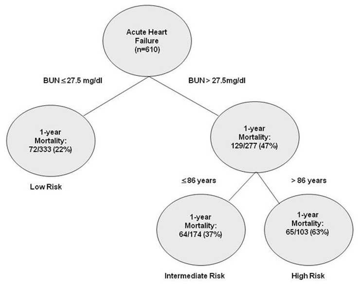 Recently, ADHERE patient records were used to develop a risk stratification tree, based on CART analysis for in-hospital mortality. Of the 39 variables evaluated, the CART method identified the following three variables as predictors of mortality: BUN levels of ≥43 mg/dL (15 mmol/L), systolic blood pressure at a discrimination level of less than 115 mm Hg and a serum creatinine level of >2.75 mg/dL (243.1 µmol/L) at admission. This analysis also found BUN to be the strongest predictor of in-hospital mortality.