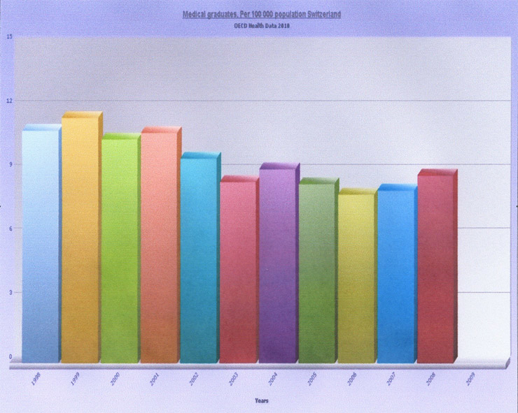 There is a progressive aging of the Swiss population with 16.8% of residents being over 64 years of age in 2009, compared to 9.6% in the early 1950s [1]. The projections for 2020 predict a proportion of 20–25% of residents to be older than 65 years [1]. As a consequence, needs for advanced treatments and particularly surgical care under anaesthesia are steadily increasing and will continue to increase. This is particularly the case for hip and knee replacements, cancer care and cataract surgery [2].In 2008, a total number of 1’166’631 anaesthetic procedures were performed in Switzerland, representing a 35% augmentation compared to 2002 [3].As a result, healthcare costs have increased greatly to reach 10.7% of the overall Gross Domestic Product (GDP) of Switzerland in 2008 [3].Annual costs related specifically to surgical care excess 11 billion francs [2].Consequently both cantons and the Swiss Confederation launched a series of initiatives aimed at controlling healthcare costs [4, 5].These include: a) a unified reimbursement scheme called TarMed introduced in 2004, b) a gradual reduction in acute care beds availability in hospitals, c) a progressive transfer of treatment costs directly to patients (30.8% of overall health expenditures, the highest rate in OCDE countries after Korea and Mexico), and d) a limitation in the number of physicians licensed and eligible for reimbursement under compulsory health insurance introduced in 2002 [6–9].In parallel, universities have limited the number of positions available for new students in medical schools by numerus clausus, which has been gradually introduced in Swiss universities since 1998 [10]. Consequently, the number of new graduates has dropped from 10.9/100’000 residents in 1998 to 8.8/100’000 residents in 2008 (fig. 1) [3].This is one of the lowest rates in Europe, as only Belgium, Poland and Slovenia have less medical graduates entering the healthcare workforce every year.