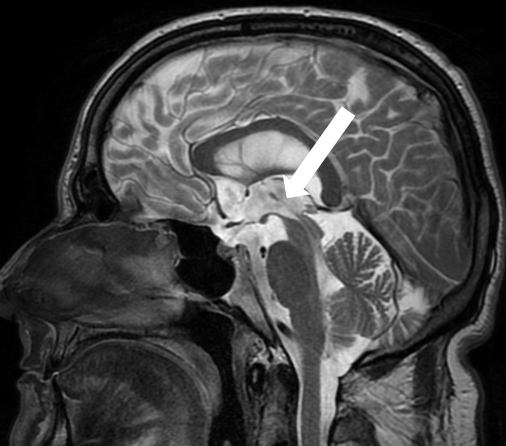 Brain MRI (T2) in sagittal plane of a patient with progressive supranuclear palsy (PSP). Note the marked midbrain atrophy adopting the appearance of a “hummingbird” (arrow).