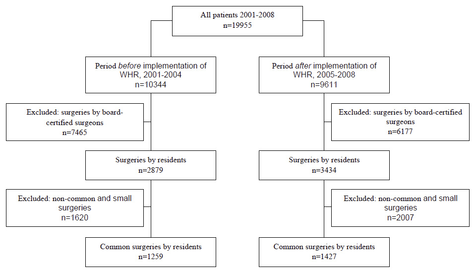 Study design. WHR: work-hour restrictions; non-common surgeries: mammary and thoracic operations, large abdominal and vessel surgeries, surgeries of the genitourinary system, treatment of hand injuries; small surgeries: excision of lymphnodes, metal removals, fracture fixations with Kirschner wires, small amputations, operations on tendons and ligaments and arthroscopies; common surgeries: herniotomy, cholecystectomy, appendectomy, thyroid surgery, proctological interventions, varicose vein operations, colorectal and small intestine surgery, and fracture fixation without Kirschner wire.