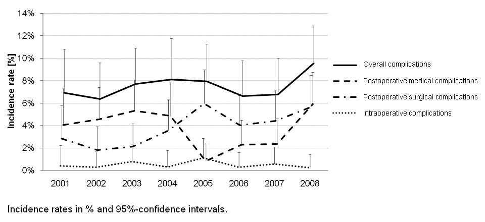 A comparison of intraoperative and postoperative complication rates revealed a significantly higher postoperative surgical complication rate after the reform (p <0.01), whereas no significant difference could be found concerning the overall intraoperative (p = 0.61) and postoperative medical complication rate (p = 0.08). Table 2 shows a detailed list of intraoperative and postoperative surgical and medical complications.