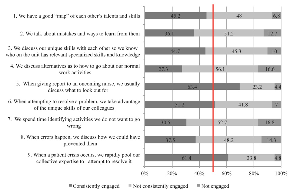 Figure 2 shows the proportion of RNs who reported that they and colleagues were not engaged, not consistently engaged and consistently engaged in each of the PSC behaviours based on the collapsed SOS categories. The behaviours that the highest proportion of the participants (63.4% and 61.4% respectively) reported that they and colleagues engaged in consistently were “When giving report to an oncoming nurse, we usually discuss what to look out for” (Item 5) and “When a patient crisis occurs, we rapidly pool our collective expertise to attempt to resolve it” (Item 9). The behaviour that fewest reported engaging in consistently was “We discuss alternatives as to how to go about our normal work activities” (Item 4; 27.3% of participants).