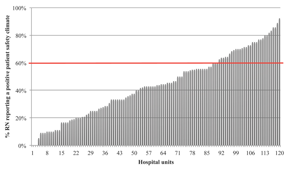 To compare the PSC on the participant medical, surgical and mixed medical-surgical units we computed the proportion of RNs on each unit reporting a positive PSC (defined as a mean SOS score ≥6). From a total of 132 units, 120 units had a response rate >50% and were eligible for this analysis. The proportion of RNs per unit reporting a positive PSC ranged from 0% to 92.31% (mean = 43.84%, 95% CI: 39.67% to 48.01%). The RN-reported PSC was positive on only 33 out of 120 units (27.5%). For three units (2.5%) no RN reported a positive PSC (fig. 1).