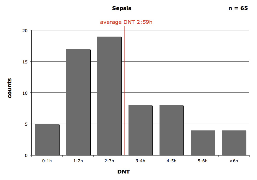 Figure 4 presents the DNT for patients with the diagnosis of sepsis. The fastest DNT was 15 minutes, the longest DNT was 9 hours after ED admission.