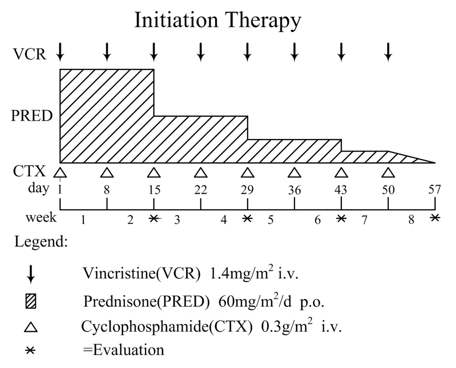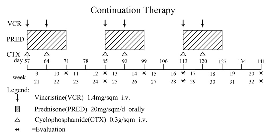The aim of subsequent therapy was to sustain remission in patients who had achieved CR. If there were some abnormalities in certain parameters but the patient had not met the definition of relapse [3], the following treatment strategies might be considered: 1. continue the continuation therapy; 2. prolong the intervals between every cycle of treatment described in the continuation therapy protocol; or 3. administer prednisone only in the minimum effective dose.