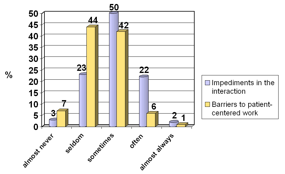 Frequency of impediments in the interaction with patients (N = 161) and of barriers to patient-oriented work (N = 151).