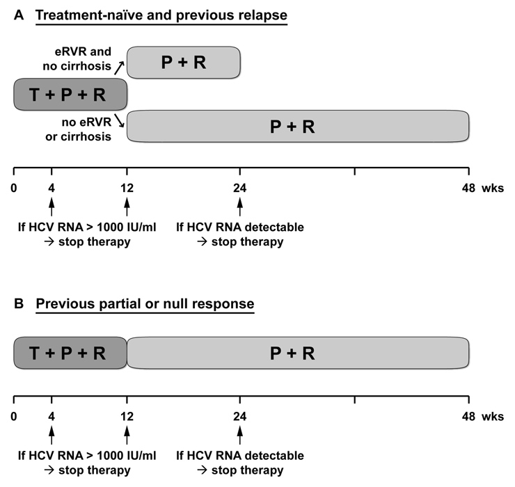Telaprevir-based triple therapy. (A) Treatment-naïve patients with CHC genotype 1 and treatment-experienced patients with previous relapse. (B) Treatment-experienced patients with CHC genotype 1 and previous partial or null response. eRVR, extended rapid virological response (see table 1 for definitions of virological response patterns); P, pegylated interferon-α; R, ribavirin; T, telaprevir; wks, weeks.