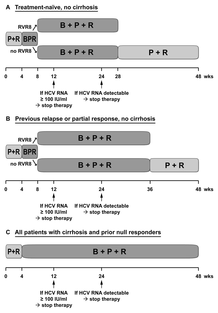 Boceprevir-based triple therapy. (A) Treatment-naïve patients with CHC of genotype 1 without cirrhosis. (B) Treatment-experienced patients with CHC genotype 1 and previous relapse or partial response without cirrhosis. (C) All cirrhotic patients and prior null responders. B, boceprevir; BPR = B + P + R; P, pegylated interferon-α; R, ribavirin; RVR8, rapid virological response at week 8 (see table 1 for definitions of virological response patterns); wks, weeks.