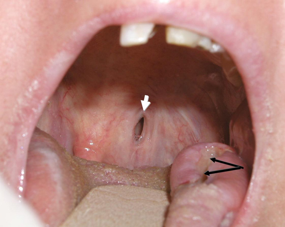 Lateral tongue ulceration (black arrows) and palatal fistula (white arrow) in a patient with GPA.