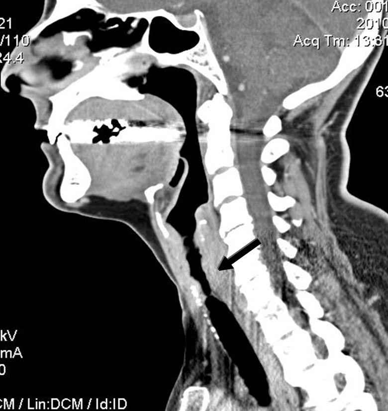 CT scan of the neck of a patient with GPA showing 6-cm-long subglottic stenosis (arrow).