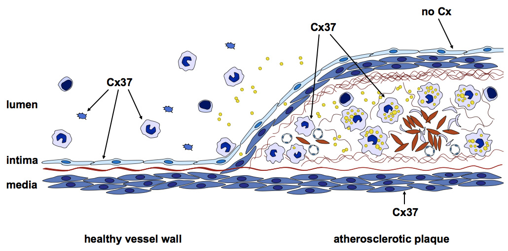 | Monocytes / macrophages | Cx37 | Cx37 | Cx37, Cx43 (in cells close to lipid core) |