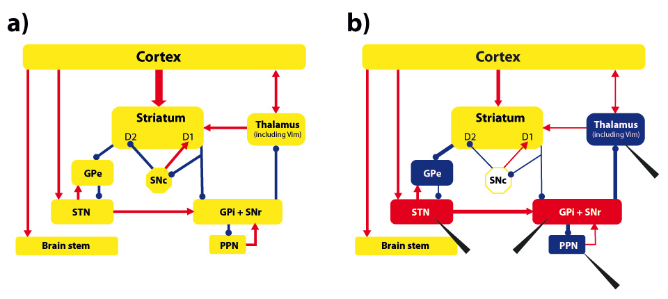A simplified scheme of the basal-ganglia and thalamo-cortical network responsible for movement control (based on [39, 40]). Part a) shows the functional network, where red lines stand for excitatory and blue lines for inhibitory connections. Part b) shows the dysfunctional network resulting from a loss of dopaminergic neurons in the Substantia nigra pars compacta(SNc). Network nodes in red color indicate hyper-activation, nodes in blue color hypo-activation. D1/D2: sub-populations of neurons in the striatum; GPe: Globus pallidus externus;STN: Nucleus subthalamicus;GPi: Globus pallidus internus;SNr: Substantia nigra pars reticulate;PPN: Nucleus pedunculopontinus; Vim: ventral intermediate part of Thalamus (Vim). Black arrowheads indicate potential DBS targets in which quadripolar electrodes are stereotactically implanted. The electrodes are connected to a pulse generator (usually placed under the skin in the subclavicular or abdominal area) that controls several parameters of the chronically applied electrical stimulation (frequency, pulse width, and amplitude). The intervention is usually made in the alert patient, as his active cooperation is required while the electrodes are positioned for evaluating target accuracy and stimulation benefit.