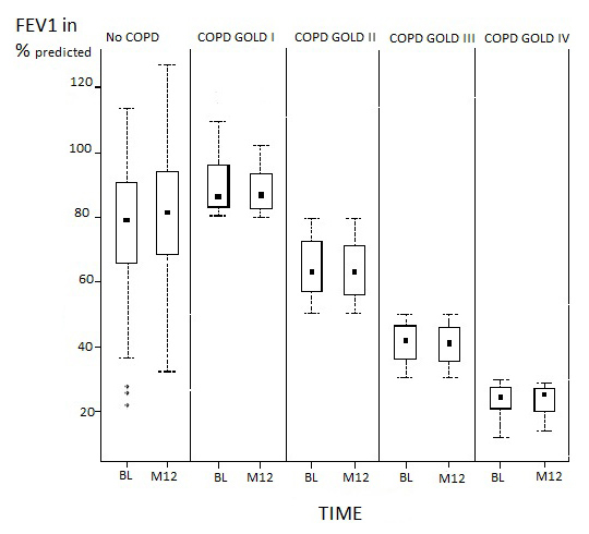 (% of COPD group), Abbreviations: COPD, chronic obstructive pulmonary disease; GOLD, Global Initiative for Chronic Obstructive Lung Disease; BL: baseline visit; M12: month 12; SD: standard deviation. |