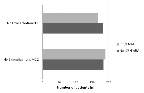 Compared with baseline, the overall exacerbation rate had fallen significantly. Factors associated with exacerbations were treatment with ICS, combination therapy, LABA or systemic steroids in stable disease.