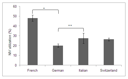 Compared to the German-speaking part of Switzerland, the French-speaking area has an increased penetration rate of NIV (fig. 2). An even higher rate is observed in the Italian-speaking part of Switzerland. This could be attributed to various reasons, including the presence of more experienced physicians in the French-and Italian-speaking areas, and an enduring French and Italian tradition in noninvasive ventilation [1–3]. Also, the satisfaction degree was higher in the French than in the German part of Switzerland. In detailing the lower degree of satisfaction, directors of ICUs at the institutions reporting low utilisation rates, identified a number of reasons explaining their perceived disappointment: the most important arguments were a lack of physician knowledge or inadequate staff training and, surprisingly, the need for better interfaces. We hypothesise that this last assertion was likely related to the lack of general experience with NIV during the different acute indications. In fact, the tolerance of patients to NIV, (and, therefore, its success) is directly associated to the mask comfort which, in turn, is linked to the amount of air leaks [18]. Oro-nasal masks, which seem to be much more efficient than the nasal masks in terms of leaks [19], were the most widely used interfaces in our survey; in these circumstances, a low degree of satisfaction (linked to the NIV failure) could be explained by other factors such as lack of dedicated NIV platforms with NIV modules or failure to recognise the presence of patient-ventilator asynchronies especially during the very first phases of NIV. As reported in the survey, all these reasons underscored the need for more education and practical training of all caregivers.