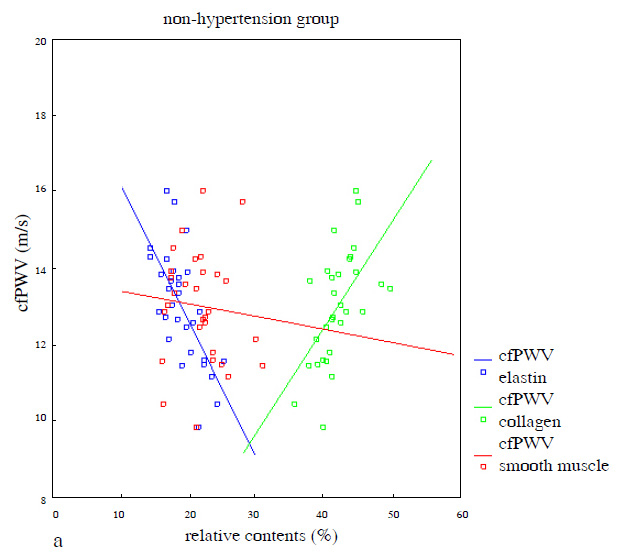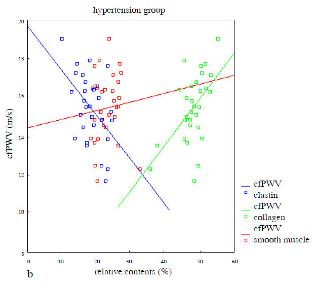 cfPWV showed a positive correlation with the relative contents of collagen (r = 0.576, P <0.01) and a negative correlation with the relative contents of elastin (r = –0.669, P <0.01), but no significant correlation with the relative contents of smooth muscle (r = –0.089, P= 0.638) in the media of the ascending aorta in the non-hypertension group (fig. 2a). Similarly, cfPWV showed a positive correlation with the relative contents of collagen (r = 0.539,P <0.01) and a negative correlation with the relative contents of elastin (r = –0.475, P <0.01), but no significant correlation with the relative contents of smooth muscle (r = 0.086, P= 0.652) in the media of the ascending aorta in the hypertension group (fig. 2b).