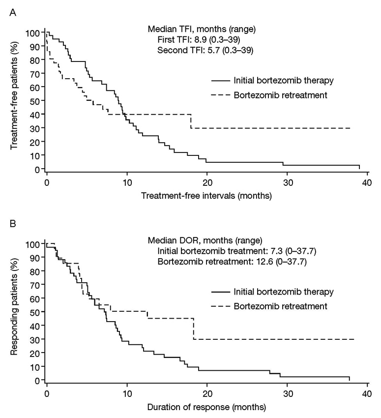 Decreasing duration of clinical benefit has previously been reported with successive lines of therapy [1] and is generally believed to be due to an increase in disease resistance after each course of treatment [1, 9, 12, 13]. In our analysis, in patients who responded to both initial bortezomib treatment and bortezomib retreatment, the clinical benefit of bortezomib retreatment was comparable to that of initial bortezomib treatment in terms of time to response, DOR and TTP.