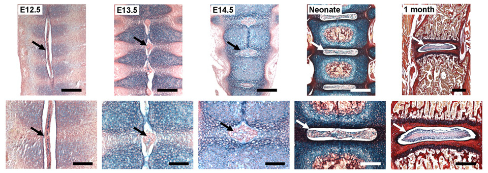 Stages of notochord transformation into the NP in the mouse embryo according to [44] (© Smith LJ, Nerurkar NL, Choi KS, et al. Degeneration and regeneration of the intervertebral disc: lessons from development. Dis Model Mech. 2011;4:31–41. Reprinted with kind permission). Embryos were stained with Alcian Blue (which marks glycosaminoglycans) and Picrosirius Red (which marks collagen). At embryonic day (E)12.5, the notochord (arrow) runs uninterrupted along the length of the vertebral column. Sclerotome cells have condensed perichordially, and metameric patterning of future disc and vertebral body condensations is apparent. At E13.5, the notochord has begun to contract within the vertebral body regions and expand within the disc regions (arrow). At E14.5, the notochord has virtually disappeared from the vertebral bodies, persisting solely in the locations of the future NPs (arrow). In the neonate, lateral expansion of the NP has occurred (arrow) and primary ossification centres are present in the vertebral bodies. At postnatal age 1 month, vertebral bodies are fully ossified and the NP (arrow) contains a glycosaminoglycan-rich extracellular matrix surrounded by the collagenous AF. Scale bars: E12.5, E13.5 and E14.5: 200 mm (top) and 100 mm (bottom); neonate: 400 mm (top) and 200 mm (bottom); 1 month: 500 mm (top) and 400 mm (bottom). Reprinted with permission from the publisher (Dis Model. Mech. 4, 31-41), available under a Creative Commons Attribution Non-Commercial Share-Alike License (http://creativecommons.org/licenses/by-nc-sa/3.0/).