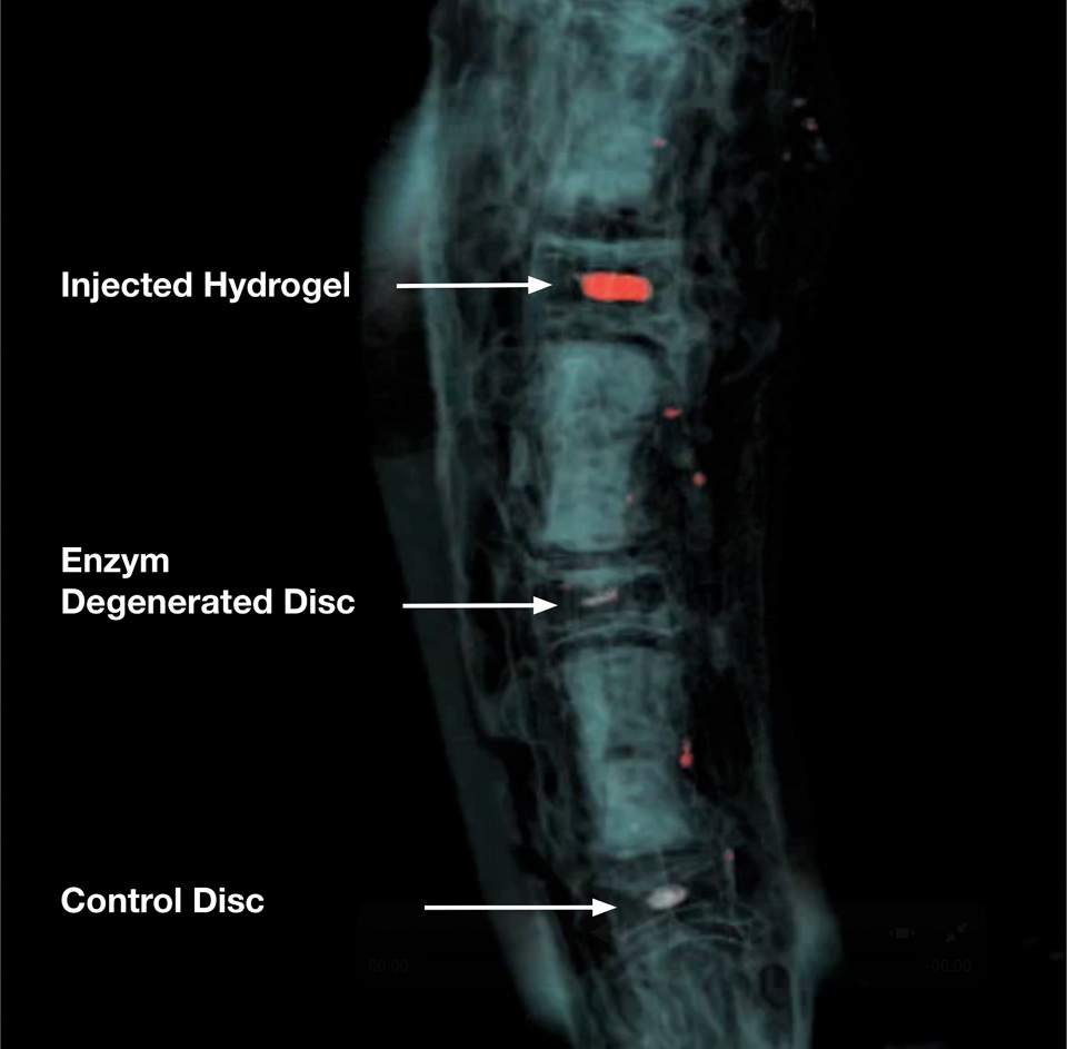 3D reconstruction of Magnetic Resonance Image (MRI) of a bovine tail intervertebral disc animal model. The upper two discs were treated with a certain dose of papain for 7 days to initiate disc degeneration. The papain enzyme was blocked with ebselen after 7 days. The NP region of the uppermost disc was then filled with a thermo-reversible p-NIPAM hydrogel (~200 µL) and imaged after ~24h on a 3 Tesla scanner (Siemens).