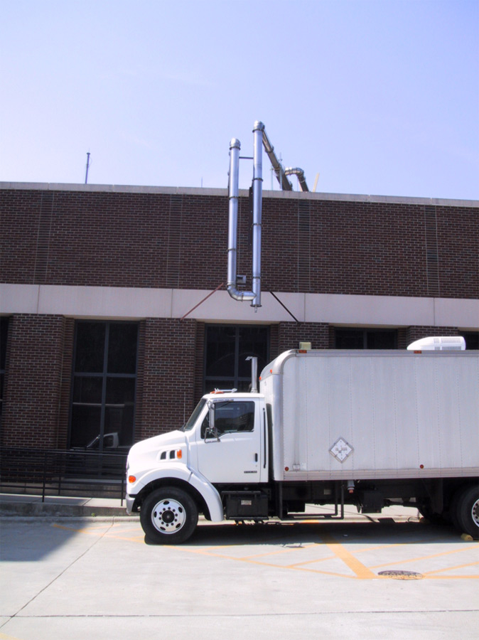 Diesel exhaust is collected from an idling truck parked outside the building (A). This is diluted with filtered air and introduced through piping into an exposure chamber (B).