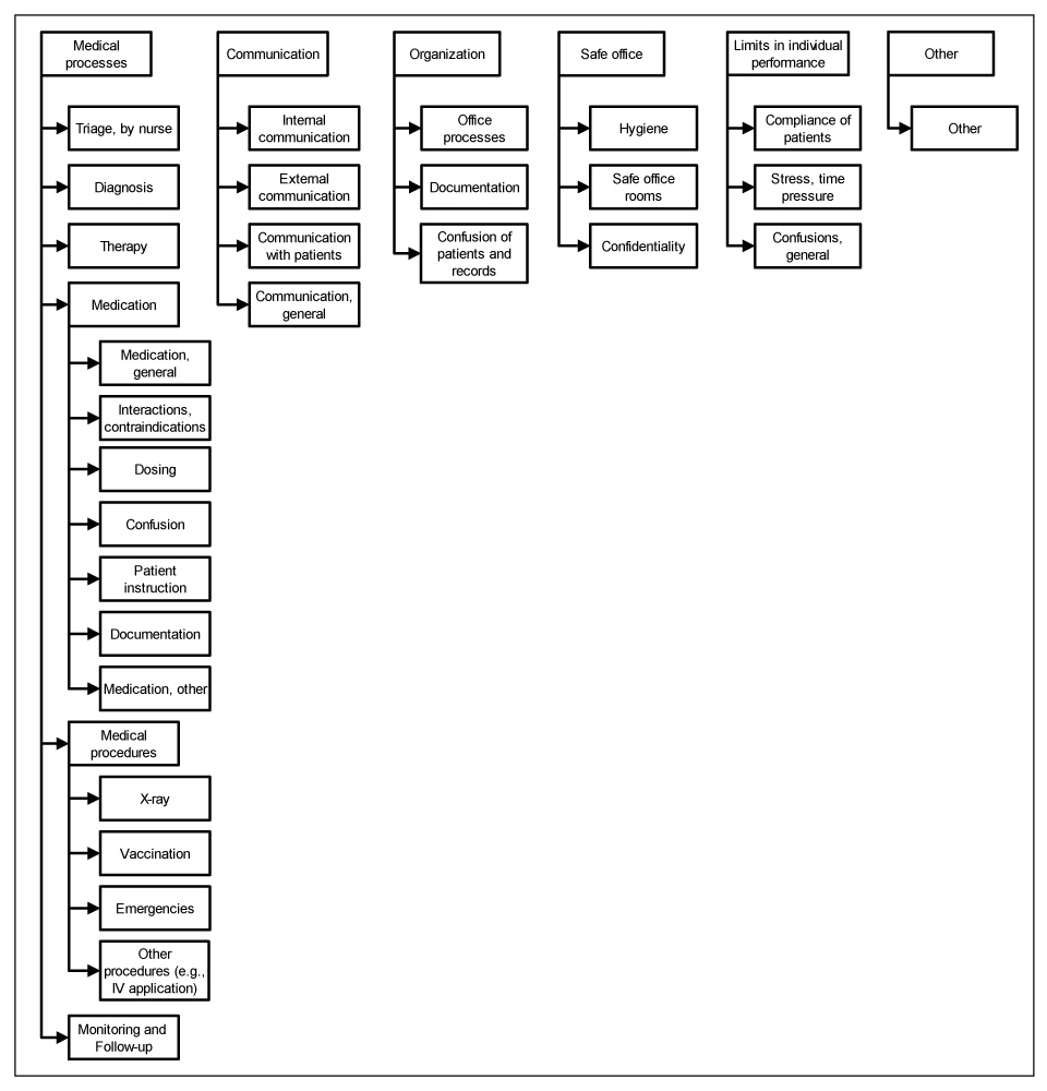 Of the 1260 invited individuals, 630 returned the survey (50% response rate). 391 (219 physicians and 172 nurses) of these 630 respondents described at least one threat to safety (62% item response, 31% response rate). Details of responders are provided in table 1. In total, 936 threats to patient safety were described by responders. There was large variability in the content and in the level of specification and detail provided by responders. Many threats described precise situations, themes and constellations, e.g., “confusion of vaccine [trademark] in children”, “interaction between [drug A] and [drug B]” or “patient falls in the office because of stairs at the entrance to the waiting area”. Other statements were less specific, such as “medication errors”, “wrong diagnosis”, or “failure in communication”. The hierarchical category system included 29 coded categories, organized in 5 main themes (fig. 1). Agreement of coders in assignment of the 29 categories was good (kappa = 0.87, CI = 0.86–0.87). Several patient safety threats were cited in different contexts and with different levels of specification. For example, “confusion” was described as an unspecified risk, as confusion of drugs in the context of medication errors (e.g., sound alikes), and explicitly as misidentification of patients and records in the context of organising office processes.